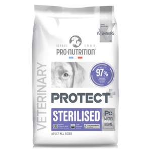 Mérsékelt energiatartalmával, fehérjében gazdag, útifű maghéjat tartalmazó formulájával, valamint az oldható és oldhatatlan rostok optimális egyensúlyával a Protect Sterilised segít a kutyáknak éhségérzettől mentesen fenntartani az ideális testsúlyt.